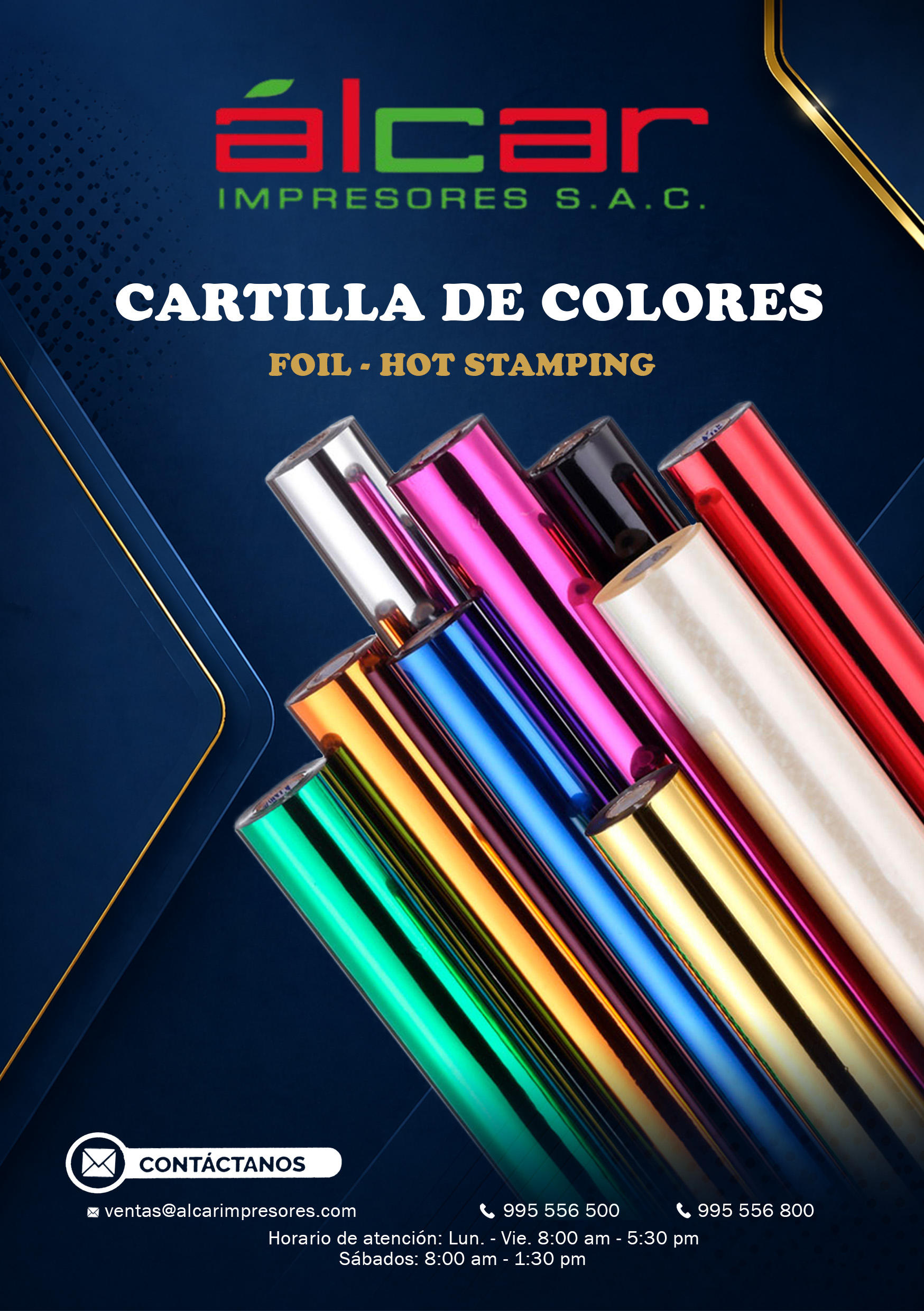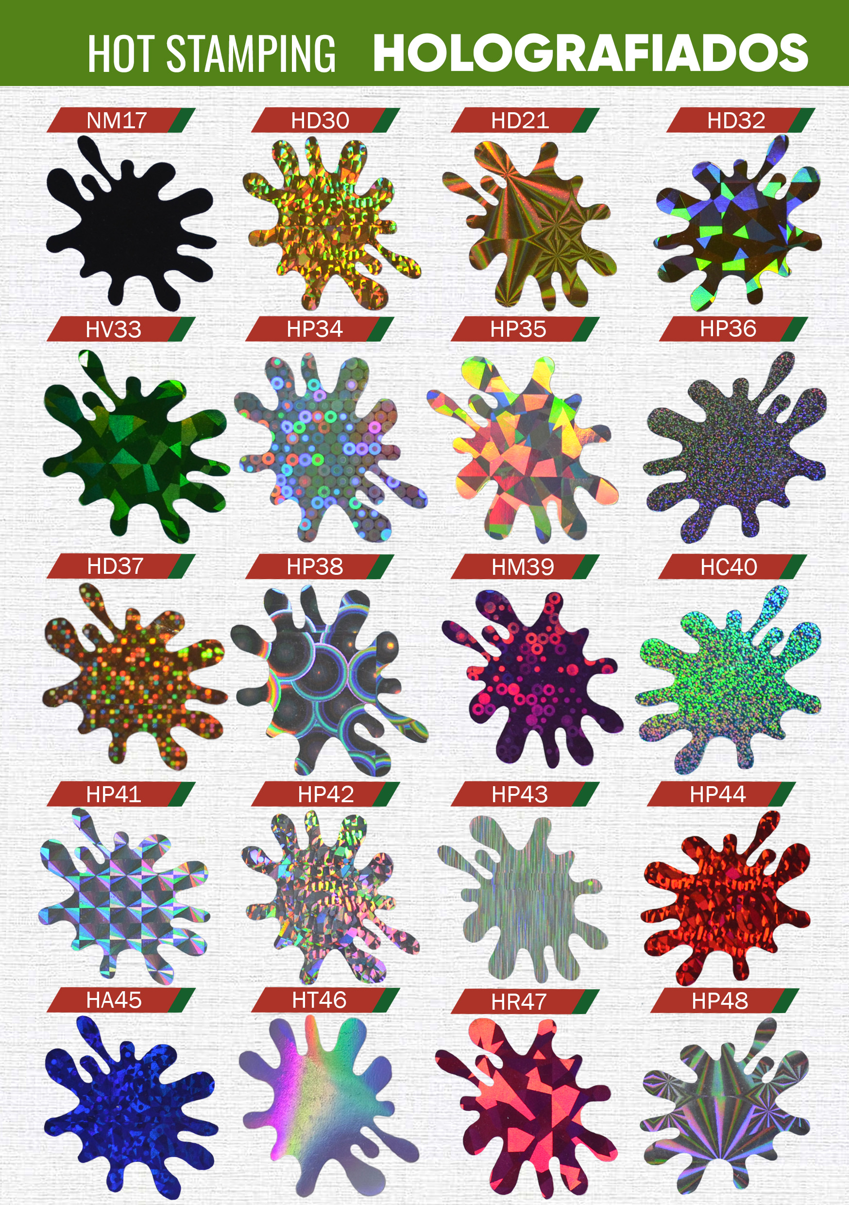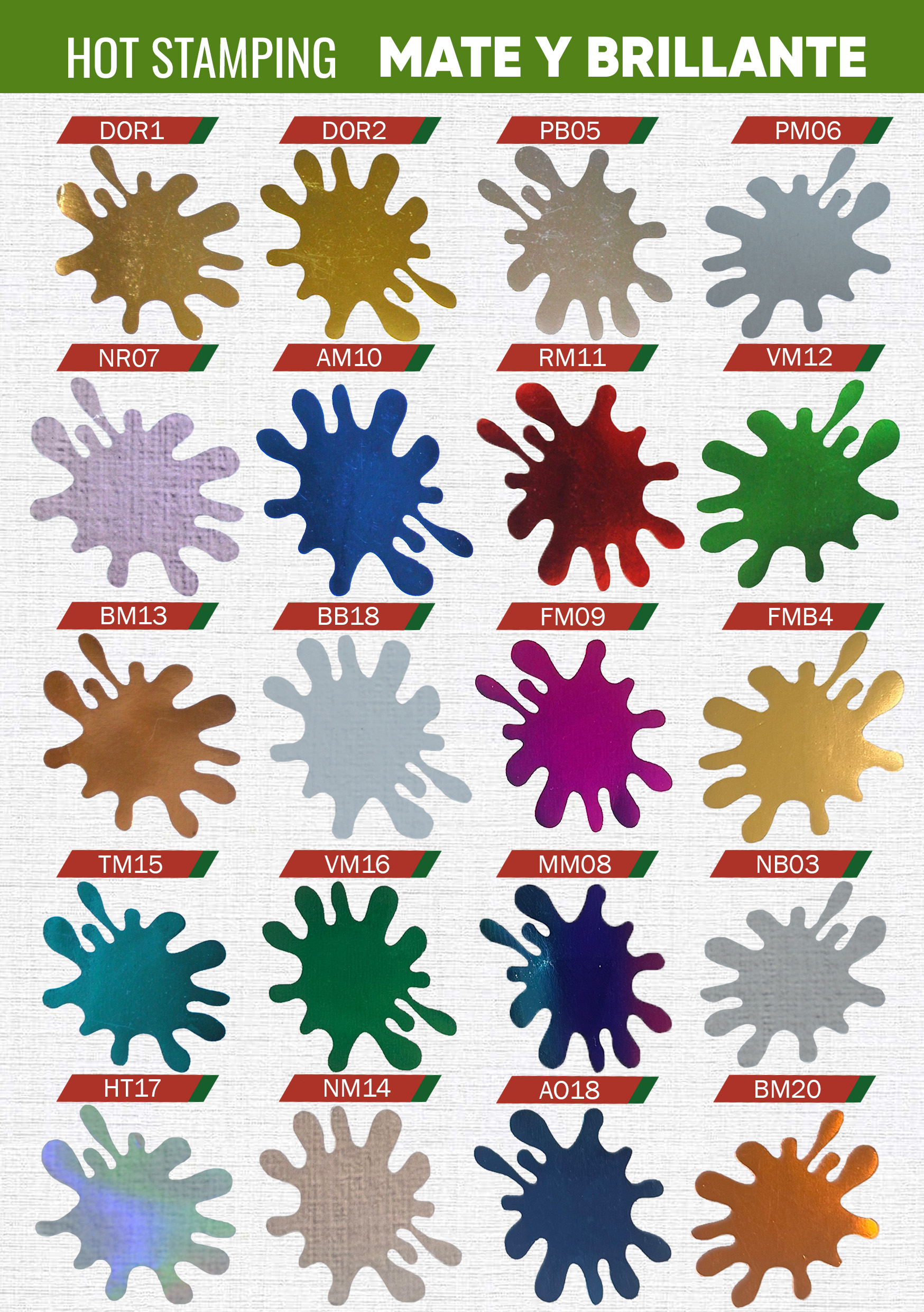 Explora colores mates, brillantes y holografiados para hot stamping. Los tonos pueden variar según pantalla, material y condiciones de aplicación; para trabajos finales recomendamos validar con muestra física.